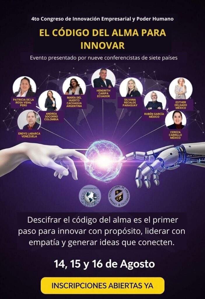 4to Congreso Internacional de Innovación Empresarial y Poder Humano El Código del Alma para Innovar Transforma empresas desde el SER humano Organizado por Conferencistas Sin FronterasCon el aval de la Cámara Internacional de Conferencistas 📅 Fechas del evento: 14, 15 y 16 de agosto⏰ Hora principal: 7:00 p.m. (hora de Ecuador) Horarios por país: País Hora 🇪🇨 Ecuador, 🇨🇴 Colombia, 🇵🇪 Perú, 🇵🇦 Panamá, 🇲🇽 México (gran parte del país, incluyendo Ciudad de México) 7:00 p.m. 🇨🇷 Costa Rica, 🇸🇻 El Salvador, 🇬🇹 Guatemala, 🇭🇳 Honduras, 🇳🇮 Nicaragua, 🇲🇽 México (algunos estados del noroeste como Sonora, Baja California Sur, Chihuahua, etc.) 6:00 p.m. 🇲🇽 México (Baja California, zona de Tijuana) 5:00 p.m. 🇧🇴 Bolivia, 🇻🇪 Venezuela, 🇨🇱 Chile, 🇩🇴 República Dominicana, 🇵🇷 Puerto Rico 8:00 p.m. 🇦🇷 Argentina, 🇺🇾 Uruguay, 🇨🇱 Chile (Isla de Pascua), 🇵🇾 Paraguay, Brasil (algunas zonas) 9:00 p.m. ¿Por qué hablar del alma en contextos empresariales? Porque hoy más que nunca, las empresas necesitan líderes auténticos, creativos y conscientes. Y eso solo se logra cuando las decisiones, los proyectos y las relaciones se construyen desde lo profundo:desde el ser, desde el alma. Tras abordar en ediciones anteriores los ejes del cuerpo, la mente y el corazón, en esta cuarta edición damos un paso más allá:el alma como centro del propósito, la conexión y la transformación organizacional. Temas que abordaremos: Una experiencia global Este congreso reúne a expertos de 7 países, uniendo saberes, culturas y visiones para transformar el mundo empresarial desde una perspectiva humana, ética y sostenible. Expertos internacionales de:🇲🇽 México | 🇵🇪 Perú | 🇦🇷 Argentina | 🇪🇨 Ecuador | 🇨🇴 Colombia | 🇻🇪 Venezuela | 🇵🇾 Paraguay ¿Para quién es este congreso? 👉 Un evento para quienes están listos para innovar desde adentro hacia afuera. 🎁 Acceso GRATUITO ✅ Inscríbete ahora y participa en vivo🔗 Inscríbete aquí – Evento 100% gratuito Este evento es completamente gratuito. Tu acceso es inmediato. Opciones Premium (opcionales): Para quienes desean profundizar, ofrecemos dos paquetes simbólicos: 📄 Certificado internacional avalado por la Cámara Internacional de Conferencistas 💰 Inversión: 10 USD 💬 Pagar con PayPal 🎥 Acceso a las grabaciones del congreso 💰 Inversión: 10 USD ✨ El conocimiento es invaluable. La inversión, simbólica. 💬 Pagar con PayPal Contactos: 📌 Si tienes alguna duda con respecto al congreso, puedes contactarnos por WhatsApp Hendrith Caripa (Ecuador)📱 WhatsApp: +593 98 305 7975 📧 Email: contacto@hendrithcaripa.com María Cachagua (Argentina)📱 WhatsApp: +54 9 387 477-4444 Silvana Recalde (Paraguay)📱 WhatsApp: +595 983 684049 Únete a la comunidad ¿Quieres seguir conectado después del evento? 👉 Únete a la Comunidad de Conferencistas Sin Fronteras ¡GRATIS! en WhatsApp:Unirse a la comunidad Aval institucional: Este evento cuenta con el respaldo de la Cámara Internacional de Conferencistas, garantizando calidad, ética y profesionalismo en cada intervención. ✨ Un evento que trasciende lo técnico y transforma lo humano No se trata solo de innovar.Se trata de reinventar desde el alma.De liderar con propósito.De construir organizaciones que no solo ganan dinero, sino que dejan huella. 👉 ¡Inscríbete ya y sé parte de la revolución del liderazgo consciente!REGÍSTRATE GRATIS AHORA
